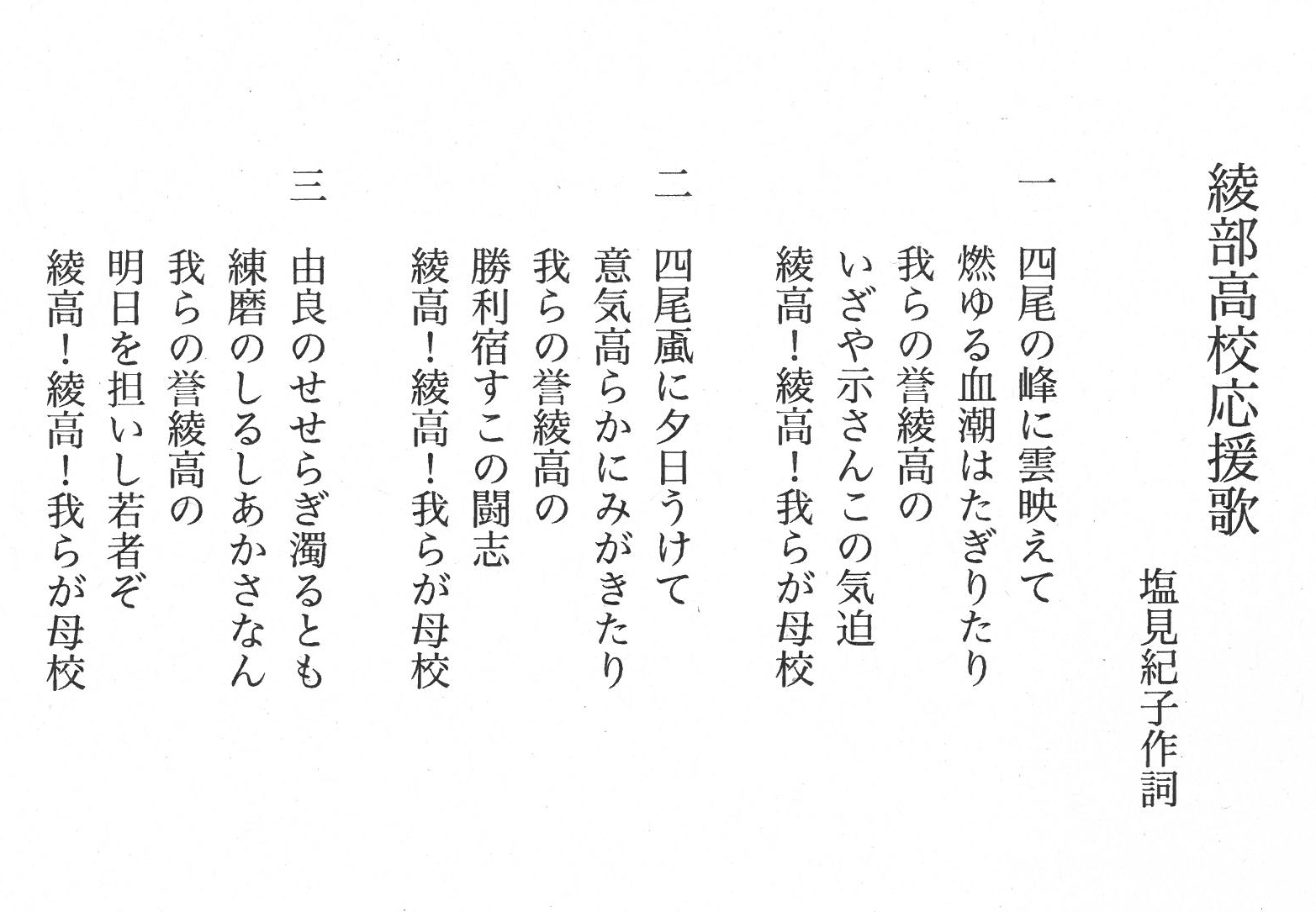PTA広報委員が行っている「綾部高校応援歌復活プロジェクト」の活動で、吹奏楽部OBで現在、MAF管弦楽団で常任指揮者を務めておられる奥村宣幸様に編曲という形で綾部高校応援歌の音源(変ホ長調バージョン、ハ長調バージョン)を作っていただきました。ぜひ伴奏に合わせて歌ってみてください。