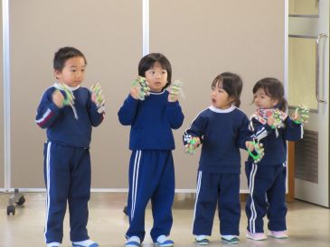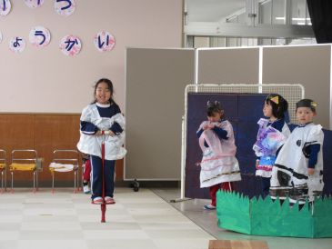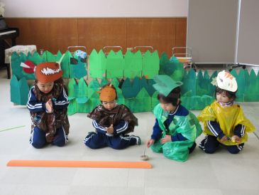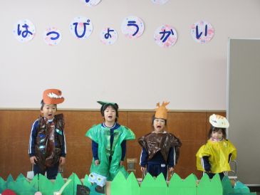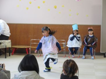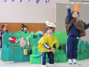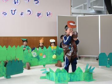 3歳児にとっては初めての発表会でしたが、実際にみんなが大好きな遊びを劇の中で元気いっぱいにできました。