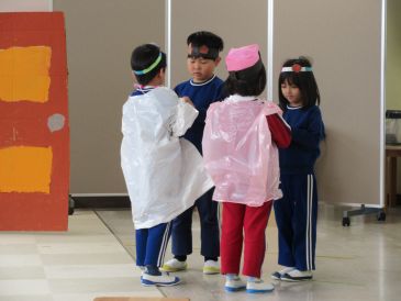 紙芝居で見た鬼のように、鬼は「いててて・・!」「まいったー」と逃げていきました。