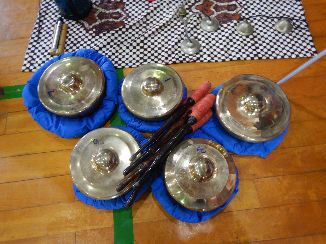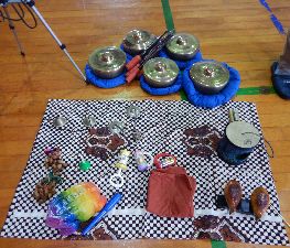 幼稚園児はカップにボタンを入れてマラカスのようにしたものや、缶のふたを叩いたり、やかんのふたをシンバルのように叩いたりして、音の出る物を探して持っていきました。講師の先生が世界の楽器も持ってきてくださいました。
