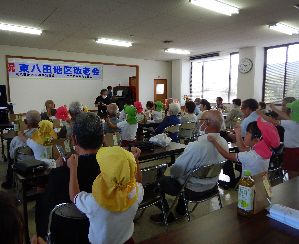 いつも地域で温かく見守って下さるおじいさまおばあさまに、元気に歌「幸せなら手をたたこう」を発表しました。そして「肩たたき」の歌を歌いながら、順番におじいさま、おばあさまの肩をたたいて触れ合い遊びをしました。「気持ちいいよ ありがとう」と言っていただきました。