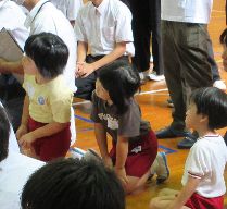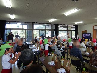 園児も「小学生の人が教えてくれたから、自分で上手に稲刈りができてうれしかったです。」などと感想を発表することができました。3歳児のみんなは、今日は応援団でした。4,5歳児や小学生が稲を刈る姿を見て