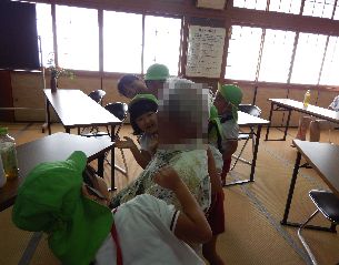 1階の部屋でリモートで参加されていたおじいさまにも、5歳児が肩たたきをさせていただきました。