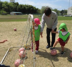 その次は足でボールを運びます。足になるとちょっと難しいね。
