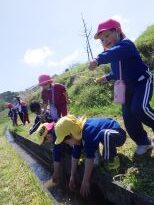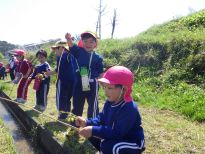 田んぼの用水路で魚釣りごっこです。葉っぱが流れてくるかな?