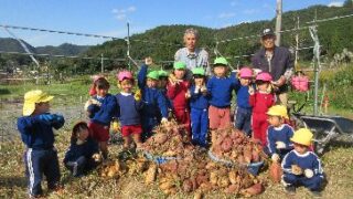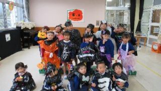 地域の英語の先生と一緒にハロウィンパーティーをしました。この日を楽しみにして、早くから衣装やお菓子の入れ物などを作っていました。始めに英語の絵本を読んでもらったり、ハロウィンじゃんけんをして遊んだりしました。