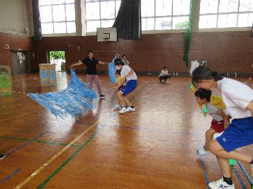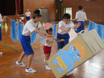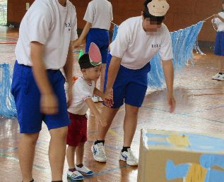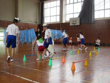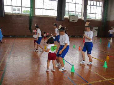 普段からいろいろな行事で顔を合わせている中学生のお兄さん、お姉さんに手をつないでもらったり、優しく話しかけてもらったりながら、競技の練習ができ、とてもうれしそうな子どもたちでした。