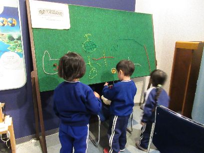 工作の後は館内で遊びました。いろんなコーナーがあり、興味津々の子どもたちです。シアターでは恐竜の映画も見せていただきました。