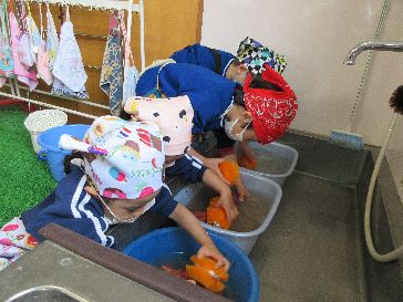 まず始めに、おひさまぐみさんがタワシを使ってさつまいもをきれいに洗います。