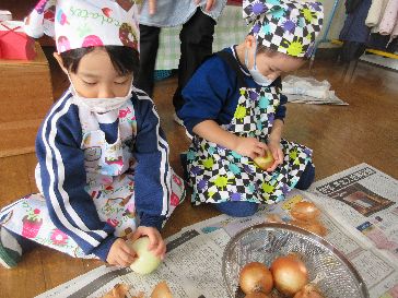 次のお仕事は玉ねぎの皮むきです。小さな手で一生懸命に皮をむきました。