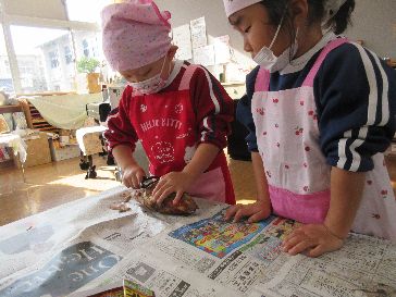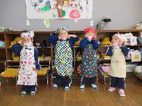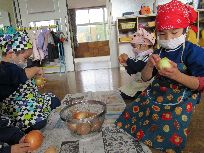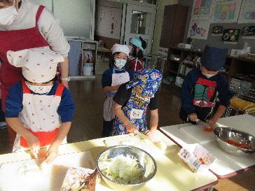 最後はそらぐみさんが野菜を切ります。指を怪我しないようにネコの手にしてゆっくりと切っていきます。「玉ねぎで目がしみるよー」「さつまいもは固いなあ!」