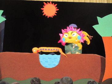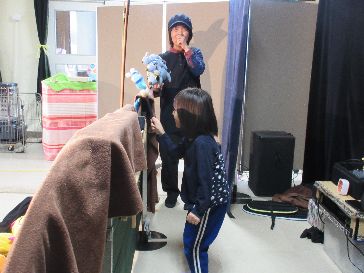 楽しいお話の後は、実際に人形を持って人形劇体験をさせてもらいました。