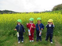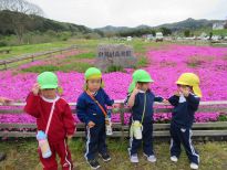 先生やお友達と菜の花畑や芝桜庭園をお散歩したあと、バスに乗って幼稚園に帰り、おいしいお弁当を食べました。