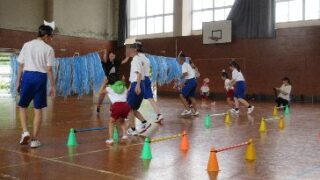 物部保育園さんと2回目のサッカー交流をしました。始めに、サッカーのコーチと一緒にみんなで「忍者手裏剣」で準備体操をしました。