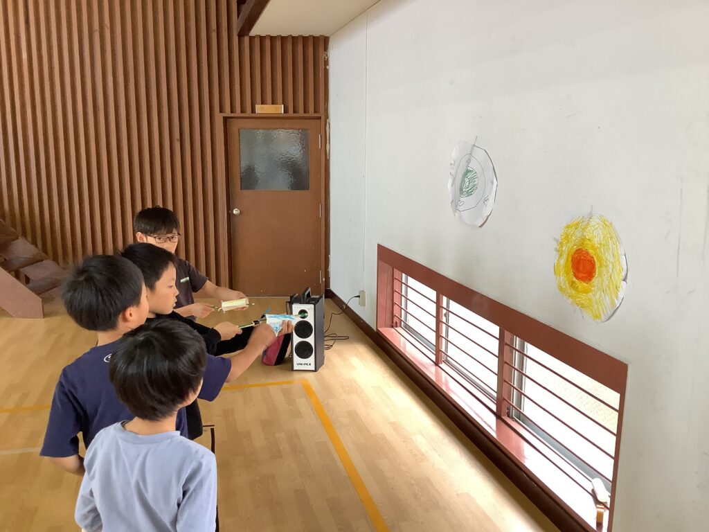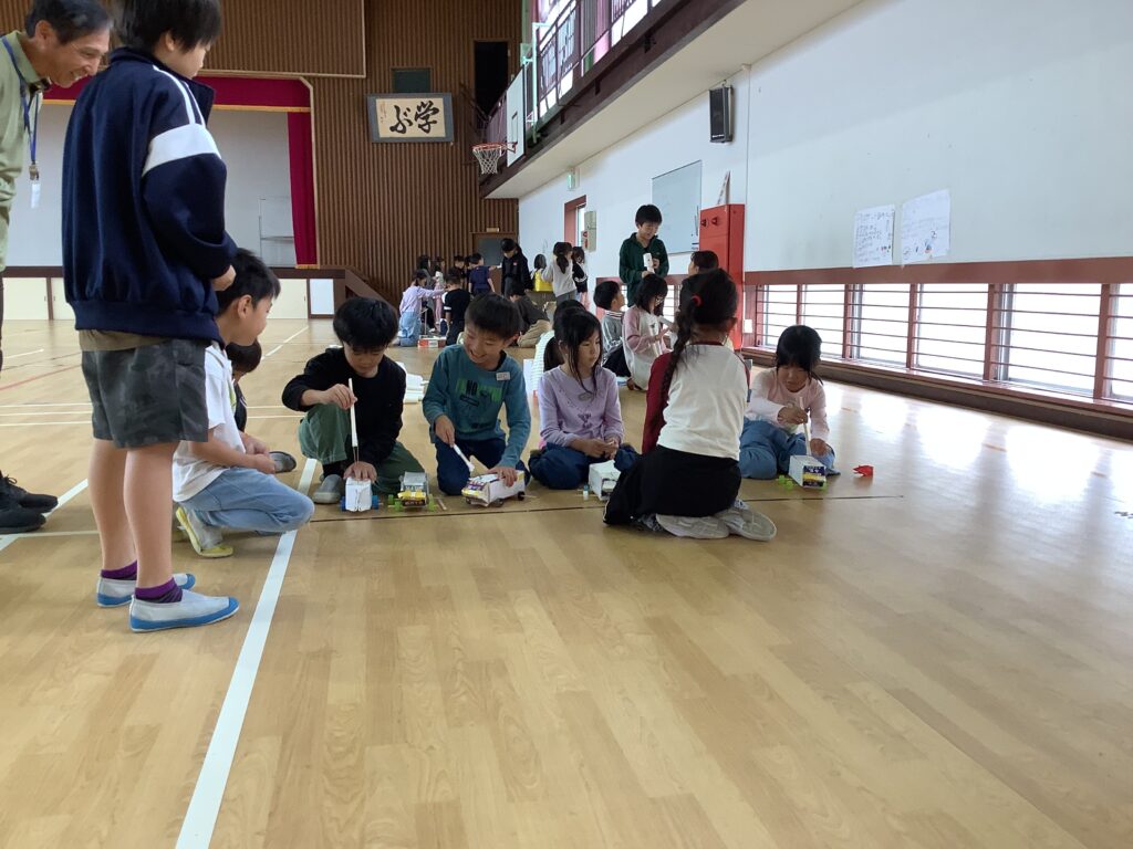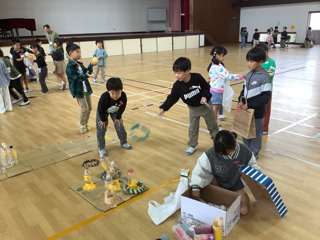おもちゃランドに招待してもらいました! 投稿 2025.10.22 1年生は、2年生が作ったおもちゃランドに招待してもらいました。各コーナーを回って、様々な遊びをしました。 1年生は、招待状をもらった時から「どんなおもちゃがあるのかな?」「何で遊べるのかな?」と、おもちゃランドの開催を待ちわびていました。 実際、遊んでみると空気やゴムの力を利用したおもちゃに加えて点数化したり勝負にしたりすることで、ワクワクドキドキするような仕掛けがたくさんあり、1年生は大喜びで遊んでいました。 来年、2年生になった時に今日の学びを生かしてくれることを期待します。