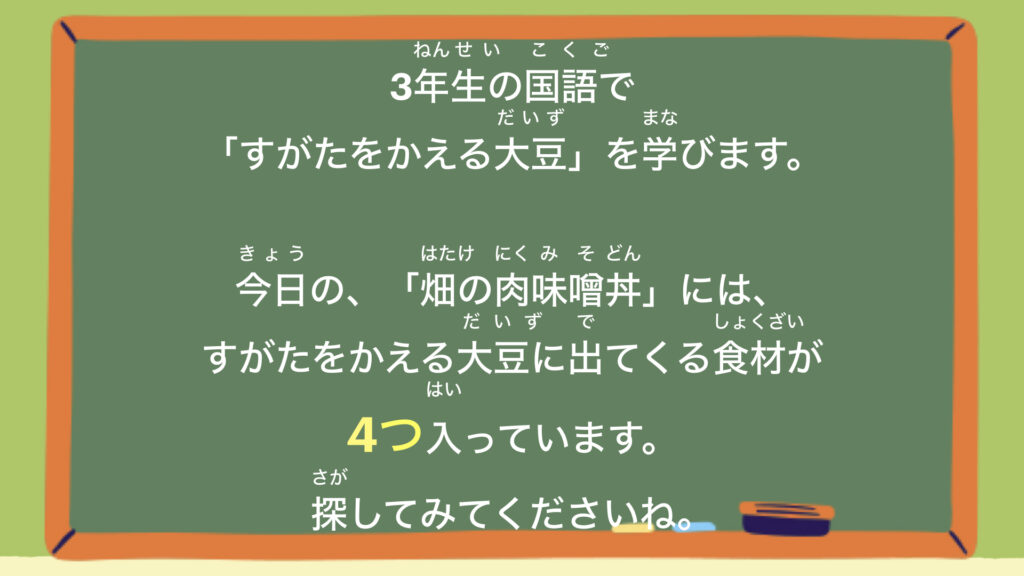給食の動画では、大豆が加工されて色々な食品に変わっていく過程をイラストで見せ、畑の肉みそ丼に入っている大豆製品を紹介しました。
