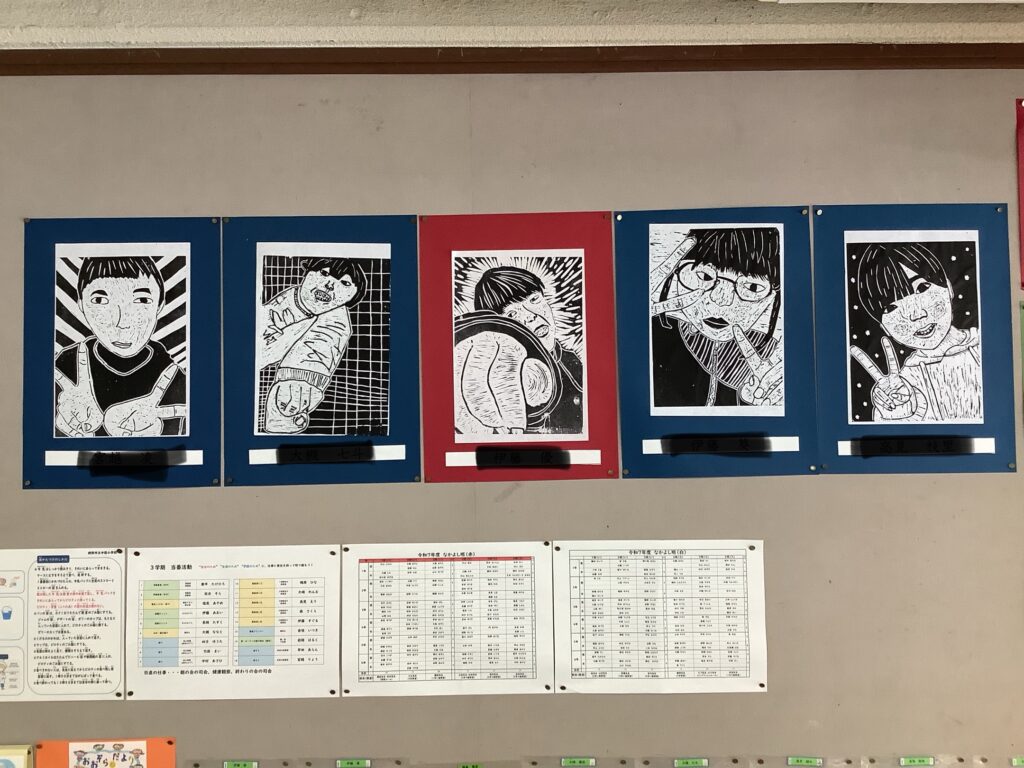 さて、6年生では版画が完成しました。小学校最後の版画のテーマは「自分」。様々な表情、角度、ポーズで自分を表現しました。彫る部分と残す部分を考えながら、集中して彫り進めることができました。6年生教室に入ってきた他学年の児童からは、「そっくり〜」「6年生すごい!」という声が聞こえました。