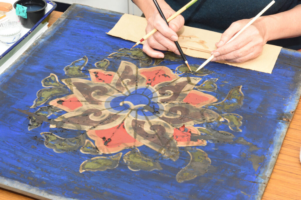 その他、屋根瓦下への雨漏れ、土壁の剥離、内陣彩色塗装の汚損・剥落などの不具合が確認されたことから、小屋組、軒までの半解体修理として工事を実施中です。