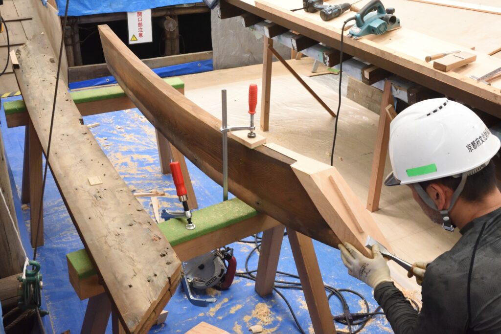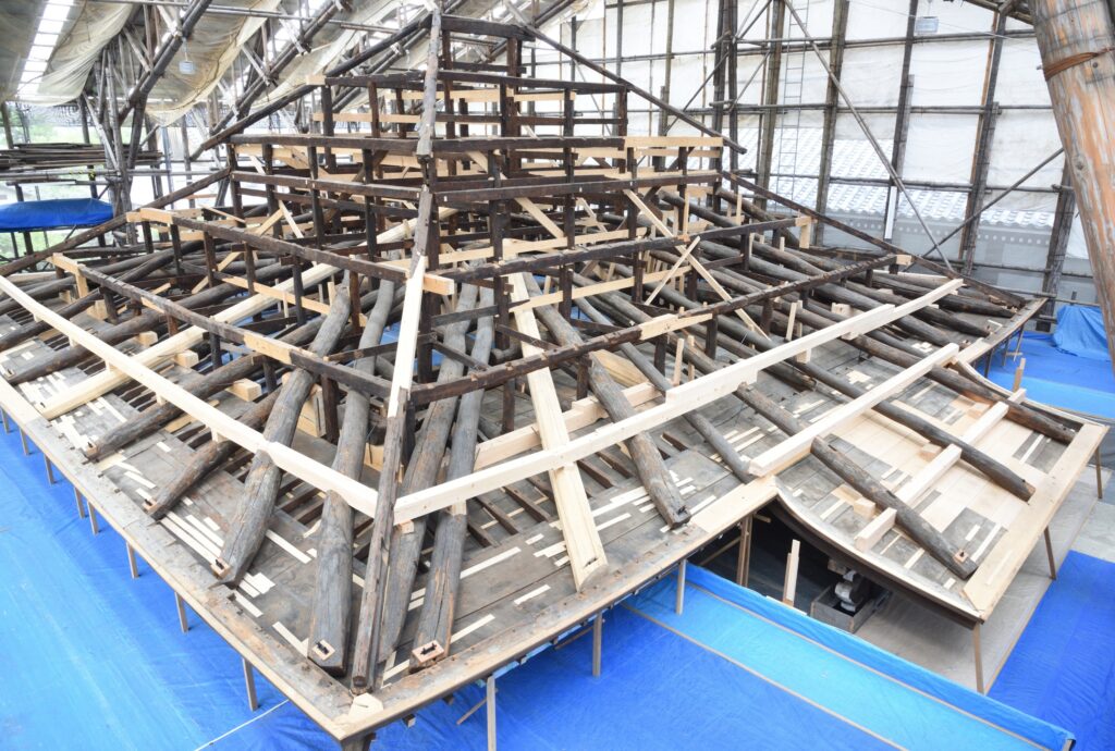 令和7年度は、小屋組・屋根下地の組立を行い、本瓦葺に着手しました。内部は、床組・天井の組立等を進めました。
