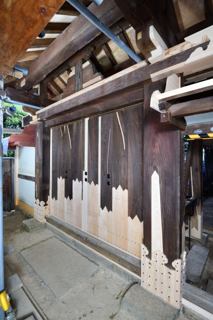 裏門は、本瓦葺屋根の緩みや木部の蟻害が深刻であったため、部材をすべて取り外して埋木や矧木等の補修を行った上で組み立て直す、解体修理を行っています。木部は、酸化鉄系顔料により赤褐色の塗装を施します。