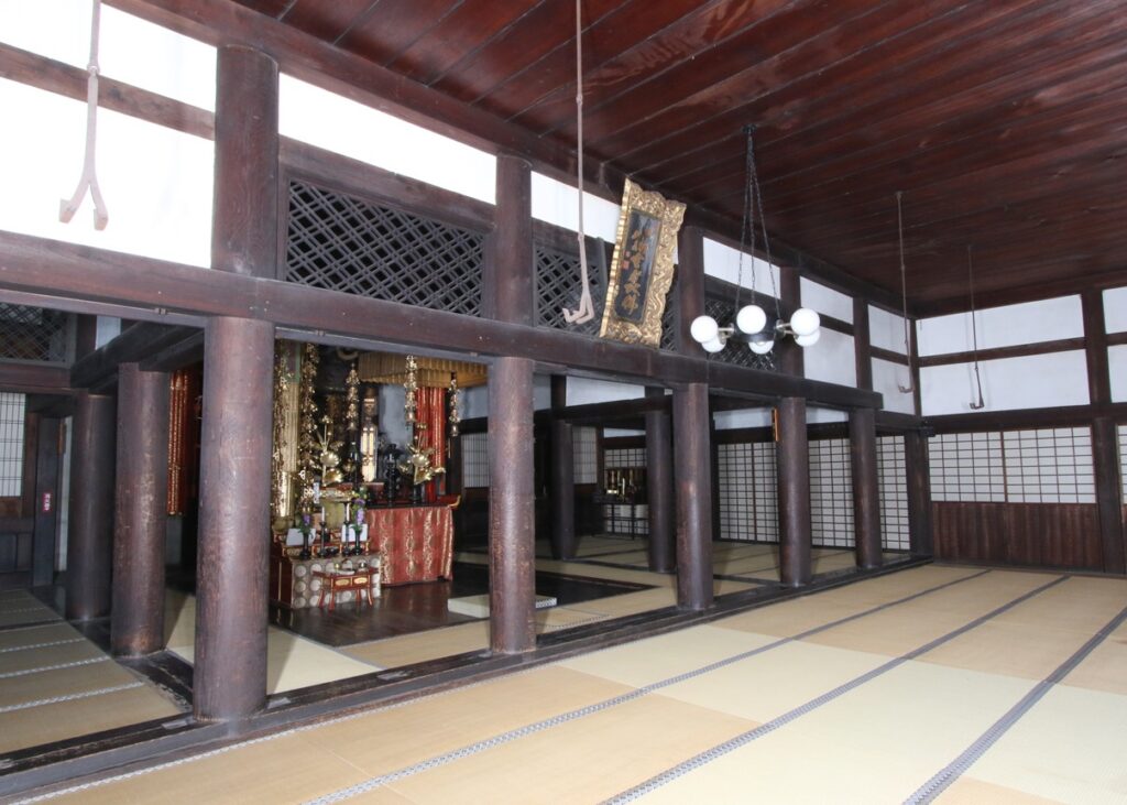 内部は、中央部後方を内陣(ないじん)として、須弥壇(しゅみだん)及び来迎壁(らいごうへき)を構え、本尊を安置しています。内陣の両脇を前後に区切って、位牌の間及び脇の間とし、内陣及び脇の間の間口に面する南側を外陣(げじん)としています。これらを落縁(おちえん)で一周囲んで、縁先に柱を建てて軒を支えています。