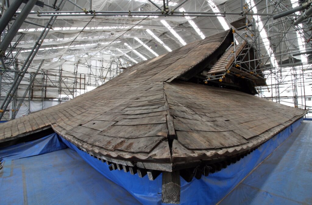 修理範囲による制約はありますが、本修理に合わせて、建物の辿ってきた修理・改変の履歴や、移築の様子のわかる痕跡などを、できる限り明らかにしたいと考えています。小屋組・屋根下地の組立を行い、本瓦葺に着手します。内部は、床組・天井の組立等を進めます。