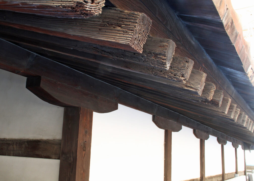 屋根は波打ったように歪んでおり、使われていた瓦そのものも、多くが耐用限度を大きく超えていて、随所に雨漏りが生じていました。屋根の歪みは、それを支える木造の小屋組(こやぐみ)の歪みによるもので、瓦を全て降ろした後、修理は小屋組に及ぶ見込みです。さらに、建物全体にわたって、木部や壁の傷んだ部分を修理します。
