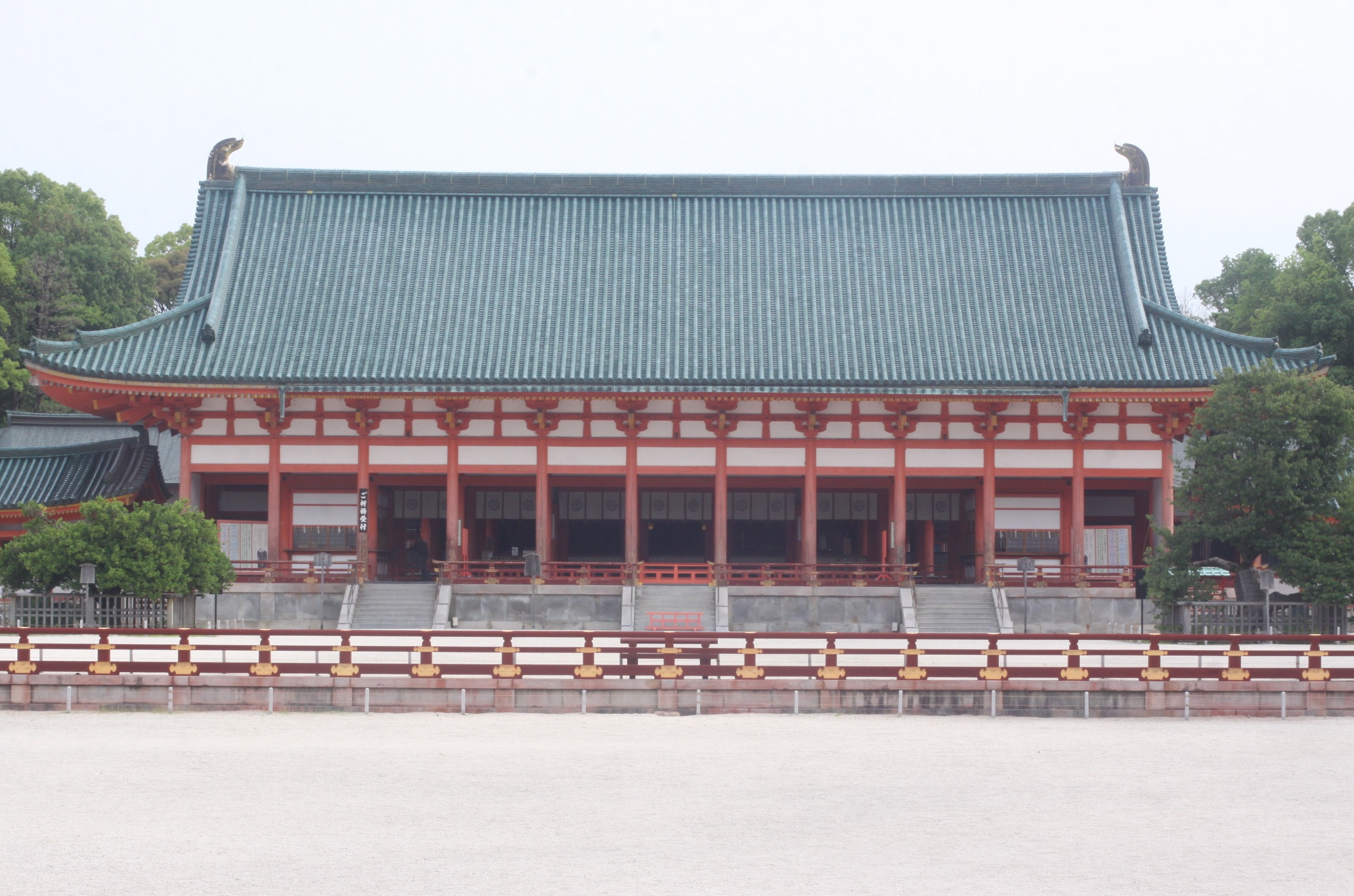 平安神宮は、明治28年(1895)、平安遷都千百年紀年祭並びに第4回内国勧業博覧会が開催されるにあたり、会場施設として平安宮大極殿院を模して計画され、平安宮の5/8の大きさとして建築されています。現在は紀念殿背後に桓武天皇、孝明天皇を奉祀する本殿が建ち、大極殿を拝殿に相当する建物として神社の施設としています。