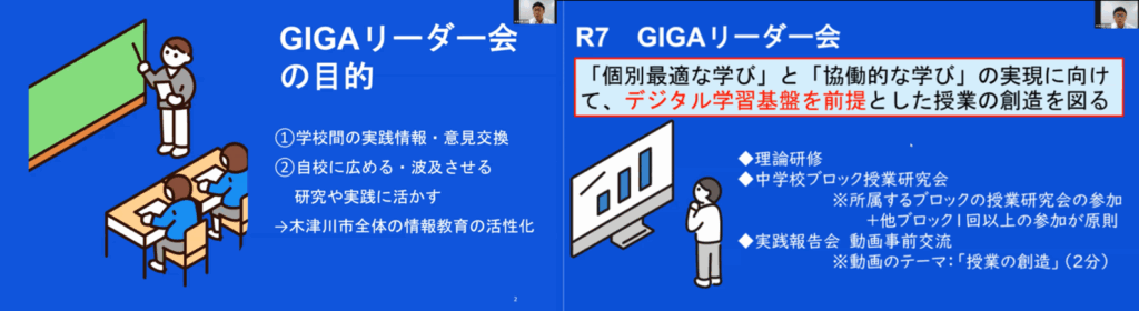 前半は、木津川市教育委員会より「木津川市GIGAリーダー会の取組」と題して、これまでの成果と課題、今年度の取組内容について発表されました。また、取組の進め方、教育委員会として意識していること等についても話されました。