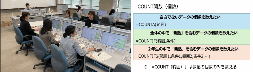 10月17日(金)、京都府立学校養護教諭研究会高等学校市内支部 Aブロック研究会にて、「Excelの基本操作と活用」の内容で、デジタル学習支援センター職員が出前講座を実施しました。講座では、データの入力やフィルター機能、関数の挿入等について、実際にパソコンを操作しながら体験しました。