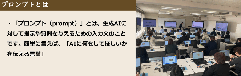 講座では、まず生成AIの基礎知識や利用時の注意点、プロンプトの入力例、Copilotの基本操作について学びました。