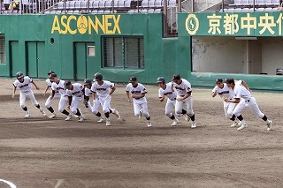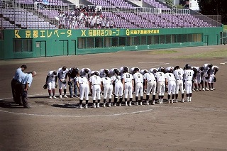 秋季大会準々決勝は、わかさスタジアム京都で鳥羽高校と対戦しました。初回に1番山下のヒット、3番宮川のレフトへのタイムリーで幸先よく1点を先制します。しかし裏の守備では、1番打者にライトへのヒットを許すなど、すぐさま同点に追いつかれます。