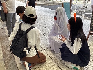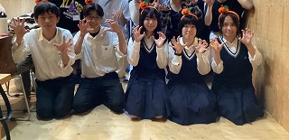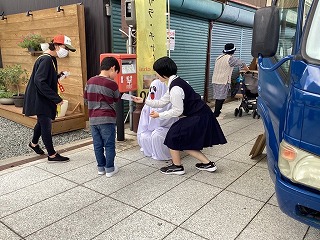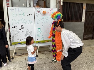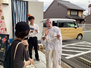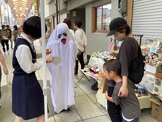 本校普通科の探究活動「みらい考Ⅱ」の「地域班」1班の活動報告です。10月11日(土)に、福知山市の新町商店街において行われた「MARCHE KOKOMORE」というお祭りに本校2年生5名が参加して来ました。これは、地域の41店舗が新町商店街に集結し、パンやクレープ、サンドイッチ、カレーなどの様々なグルメや、手作り小物のお店、フェイスペイント体験、即興劇などの出し物を、一気に楽しめるお祭りでした。福知山公立大学学生団体DOKKOさんと協働し、生徒たちは、「地域の人々とつながり、このお祭りをより盛り上げる」という目的のために、主に子どもたちを相手に、クイズやミニゲームを行い、スタンプラリーのお手伝いを行いました。ハロウィンのコスチュームに身を包んだ大学生の先輩とペアになり、小さい子どもたち相手に積極的に話しかけ、地域の子どもたちに大いに楽しんでもらうことができました。様々なお店を見て回るだけでも楽しいイベントでしたが、大学生や高校生が地域の御家族の方々や子どもたちと楽しく会話を交わすことができ、さらに活気のあるお祭りにすることができました。