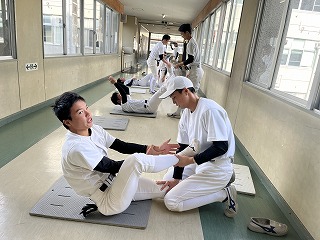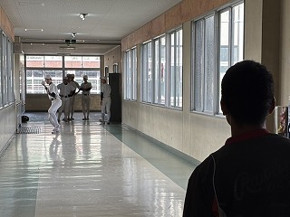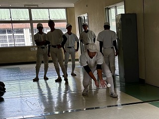 11月3日(月)は朝まで降り続いた雨のためグラウンドが使用できず、体育館も他の部活が利用していたため、校舎内で練習を行いました。前日の練習試合で出た課題を朝のミーティングでしっかりと再確認し、練習に取り組みました。