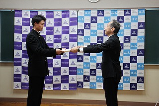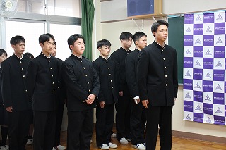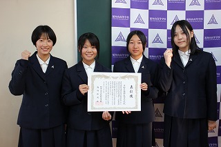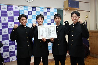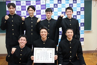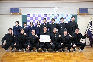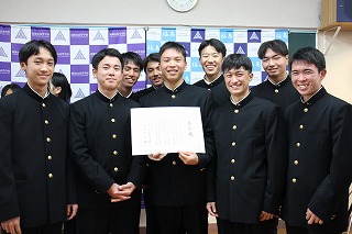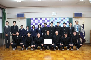 学業と部活動を両立させているところや、選手11人という少人数で秋季大会を戦い8強入りしたことなどが評価されました。選手は緊張した面持ちで式に参加しましたが、賞状を受け取り、記念撮影のときにはいつものはじけた笑顔を見せてくれていました。