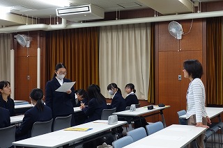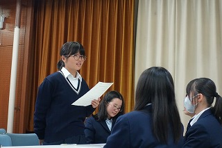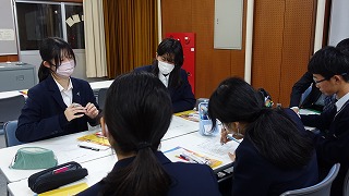 それを受けて生徒は「自分(たち)にできる国際支援ってなんだろう」というテーマのもと、グループで意見交流を行いました。生徒が自分の意見をただ発信して終わりではありません。ある生徒の考えがまた別の生徒の考えとかけ合わさり、どんどん思考が深化されていきます。最終的にはグループ内で出てきた考えを代表者が全体で発表しました。