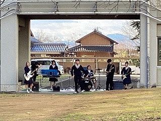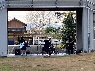 12月16日(火)の昼休み、中庭で音楽部のクリスマスライブが行われました。演奏した曲は、Hump Backの「恋をしよう」とマカロニえんぴつの「恋人ごっこ」で、クリスマスを感じてもらえるような選曲にしました。新しい楽器も加わったクオリティの高い演奏で、中庭に一足早いクリスマスが訪れました。
