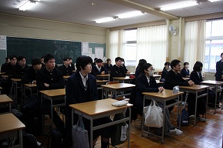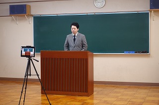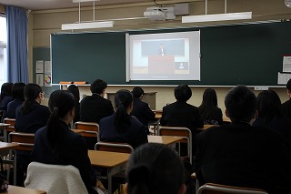 次に、中学校代表から中高一貫校としての関わりについてお話がありました。今年度は多くの高校の授業が中学校の教室で行われ、中学生は黒板に残された難しい内容や高校生の授業への姿勢から、将来の自分の姿を学んでいます。このような日常的な交流が本校の良さであると伝えられました。