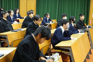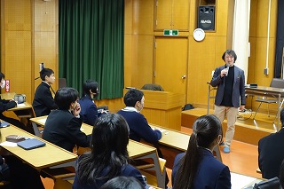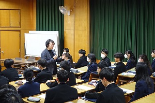 文理科学科1年の総合的な探究の時間「みらい学Ⅰ」の授業で、最終ポスター発表に向けた特別講義を実施しました。当日は、講師として、プレゼンのスペシャリストである福知山公立大学准教授の杉岡秀紀先生をお招きし、「プレゼンテーションの技法 ~聞き手に火をつけるプレゼン術~」というタイトルで講義をしていただきました。