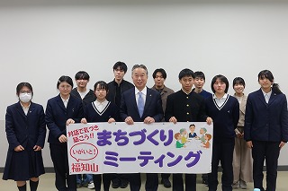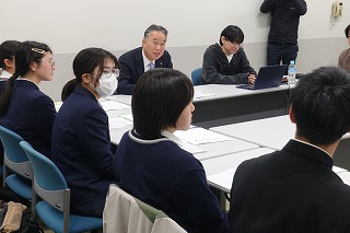 2月4日(水)、福知山公立大学にて「市長のまちづくりミーティング」が開催されました。11月に能登半島の復興支援ボランティアに参加した本校生徒6名と、福知山公立大学の学生5名が、大橋市長に活動内容を報告するとともに、防災について意見交流を行いました。生徒たちは、現地に行ったからこそ得られた思いや、福知山市でどのような支援ができるかなどについて発言しました。市長からもさまざまなお話をおうかがいし、地震をはじめとする災害への備えや復興支援について、あらためて考えることができる機会となりました。