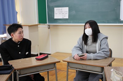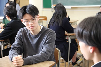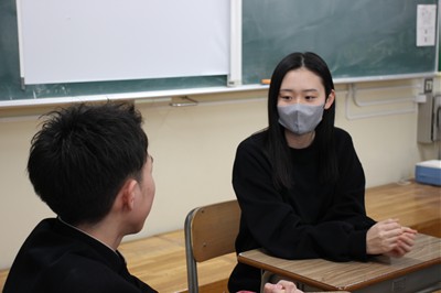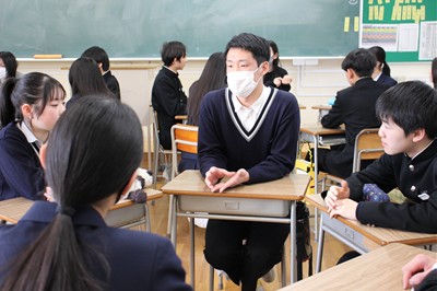 総合型選抜や国公立大学前期入試で合格した高校3年生が、中学3年生に高校生活や進学についてのアドバイスをしました。中学生からの「苦手科目をどのように克服するのか」、「1日の時間の使い方をどのように工夫していたか」などの質問に対して、自分たちの経験をもとに話をしました。中学生はメモをとりながら真剣に耳を傾け、これから始まる高校生活のイメージを膨らませていました。ひたむきな中学生の姿を見て、これから大学へ進学する高校3年生も励みになりました。