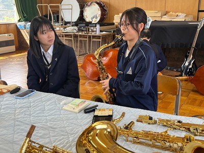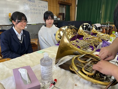 3月24日(火)、楽器屋さんにお越しいただき、楽器の調整・修理をしていただきました。1 年間、コンクールや野球応援、演奏会などで役目を果たしてくれた楽器たち。専門家の方々に調整をしていただき、本来の良い響きを取り戻しました。また、専門家の方から、普段のお手入れについてもアドバイスしていただきました。