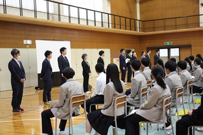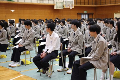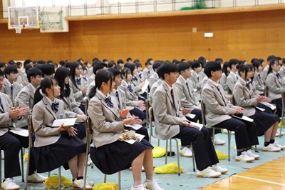 4月10日(金)、新入生対象のオリエンテーションが実施されました。担任・副担任の紹介の後、学年部長・担任から新入生に対して講話がありました。続けて、京都府警察本部生活安全部少年課の方から交通安全に関するお話をしていただき、各分掌部長の先生方からのこれからの学校生活に関するお話がありました。休み時間には全体で集合写真を撮影するなど、少しずつ生徒の表情も和らいできた様子です。
