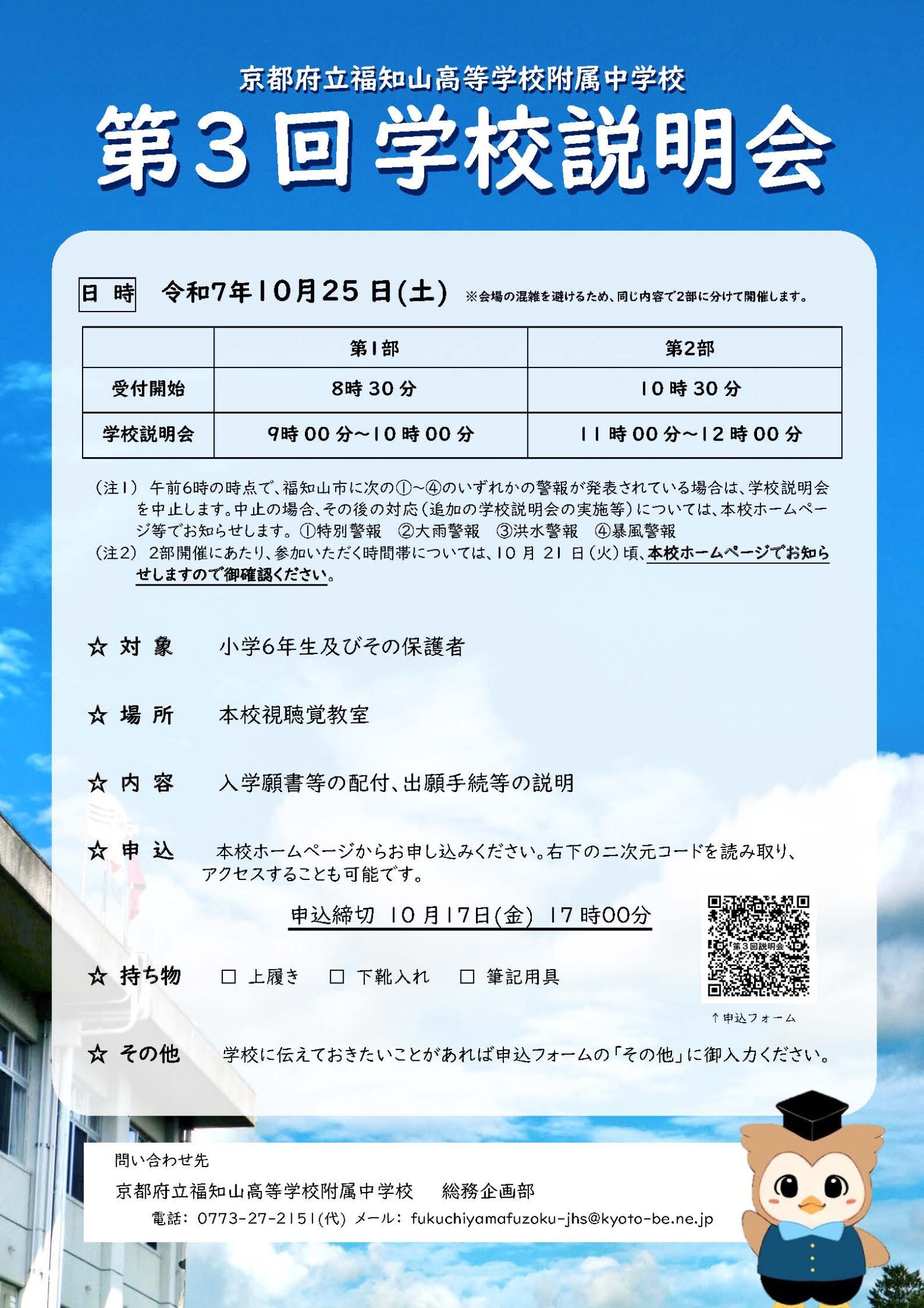 附属中学校TOP Twitter Facebook はてブ Pocket LINE コピー 2022.11.10 第3回学校説明会について 申込フォーム ≫新着情報 【移動図書館】テーマ「ミステリー」2025年10月7日 Welcome to Fukuchiyama J.H.S.🐨!2025年9月22日 福高祭最終日【体育祭!!】2025年9月12日 福高祭3日目【体育祭!】2025年9月12日 福高祭2日目2025年9月12日 福高祭1日目2025年9月11日 科学の甲子園ジュニア全国大会出場決定2025年9月11日 ソフトテニス部 研修大会2025年9月5日 9・10月学校行事予定2025年9月4日 2学期が始まりました2025年9月2日 全日本中学校陸上競技選手権大会2025年9月1日 近畿総体 陸上競技の部2025年8月31日 ログイン ~リンク~