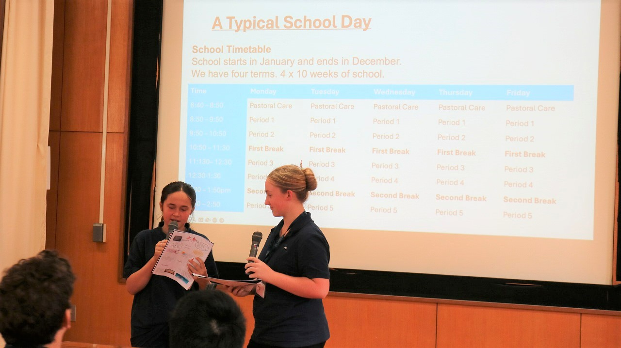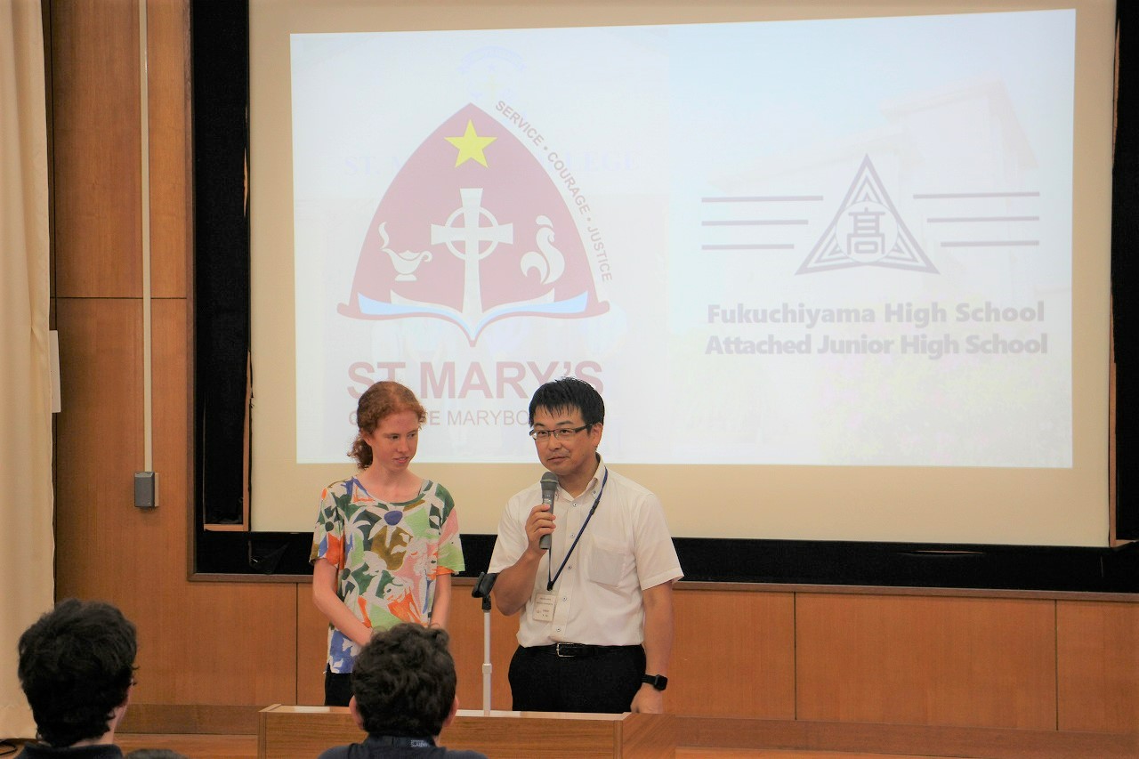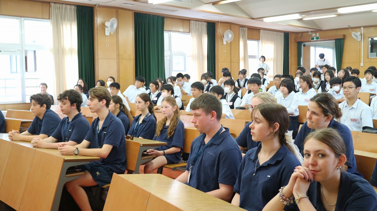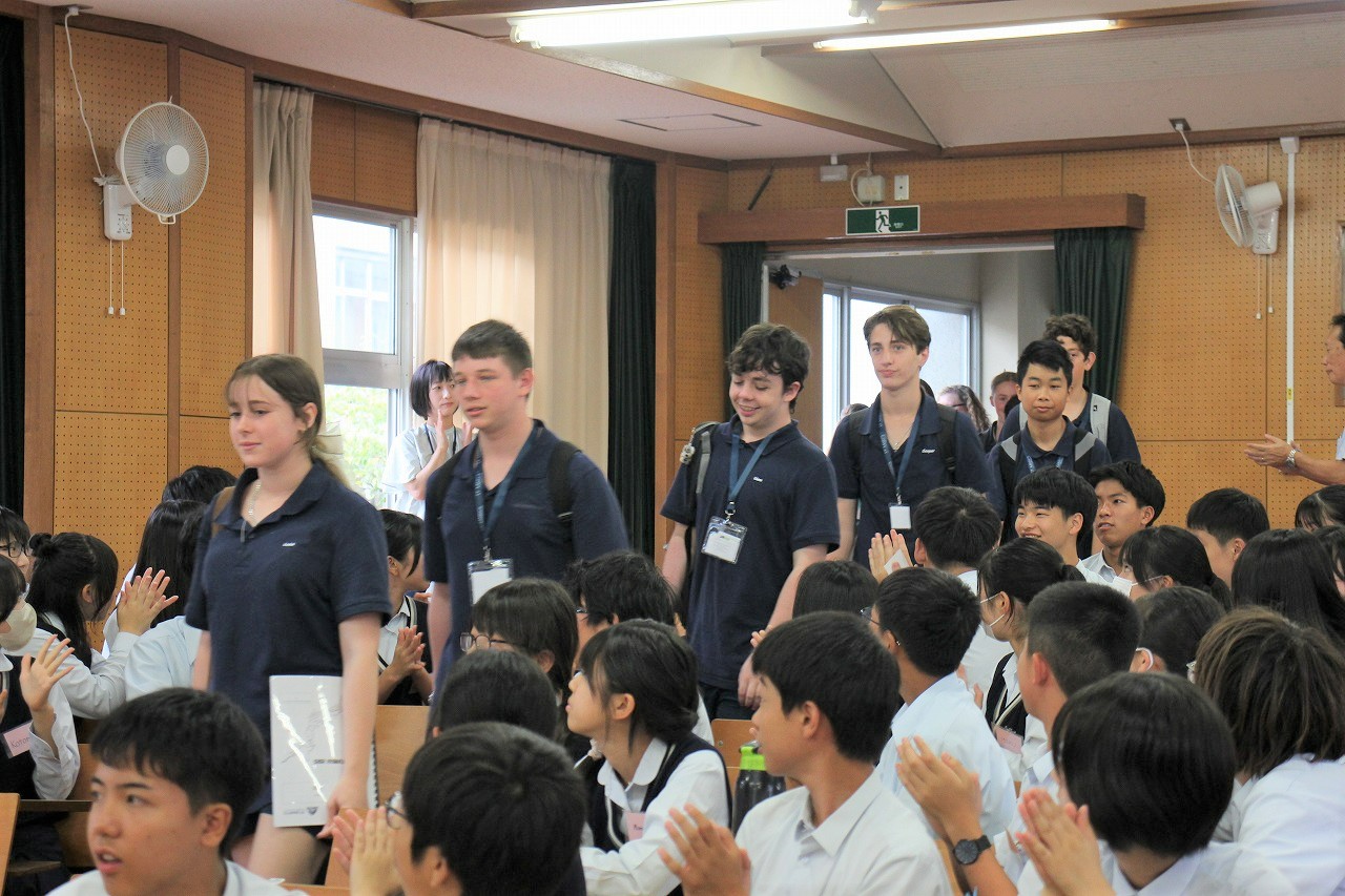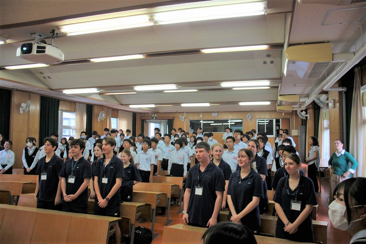 歓迎セレモニーでは、英語部の司会のもと、代表生徒があいさつをしたり、オーストラリアの国民的な歌 “Kookaburra” を一緒に歌って和やかな雰囲気になりました。
