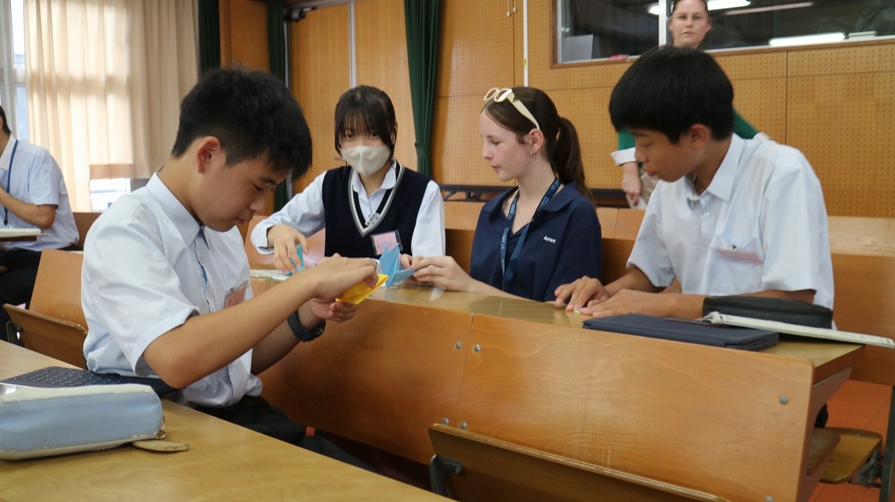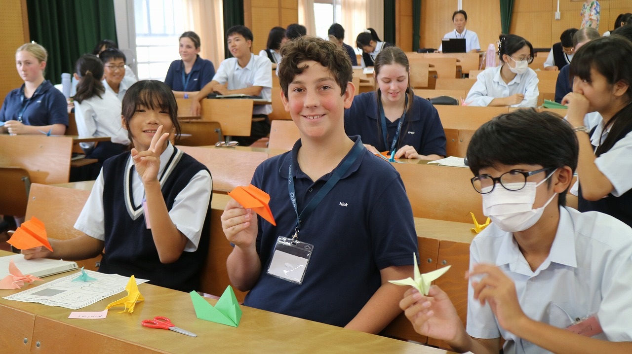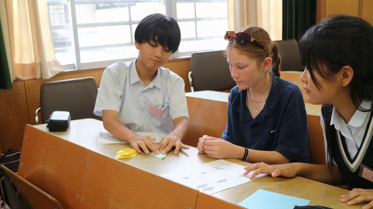 2年生は折り紙を通じて交流しました。英語で折り鶴の折り方を伝えたり、紙飛行機を一緒に折って飛ばす競争をしました。紙飛行機はオーストラリアの子どもの間でもよく親しまれているようで、オーストラリア流の折り方を教えてもらっている生徒もいました。互いに工夫しながら、一生懸命に英語で伝えていました。
