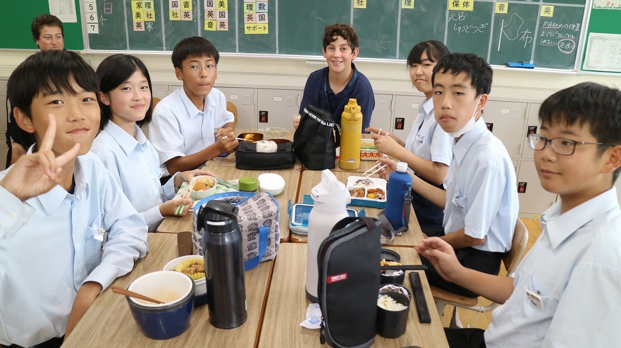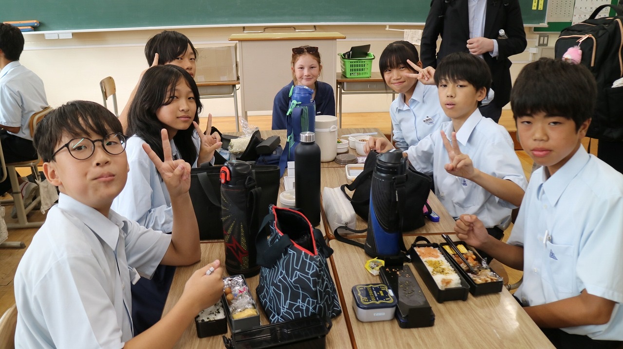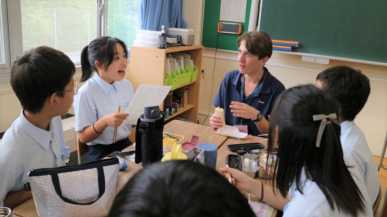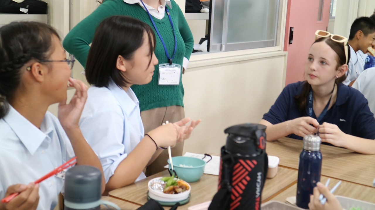 昼食時は1、2年生が教室で一緒にお弁当を囲みました。彩り豊かなお弁当の中身に、オーストラリアの先生方も興味深そうに目を向けていました。1年生もこれまで習ってきた表現を使い、食べ物やアニメのことなどについて積極的に質問し、生きたコミュニケーションを楽しんでいました。