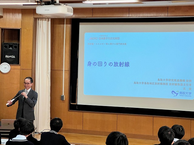 11月21日(金)、2年生・3年生を対象に、日本原子力文化財団の専門家による特別講義を実施しました。講師には、鳥取大学の北 実先生をお招きしました。