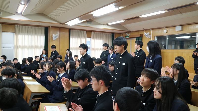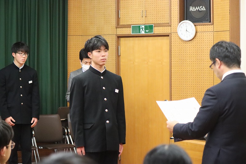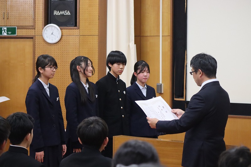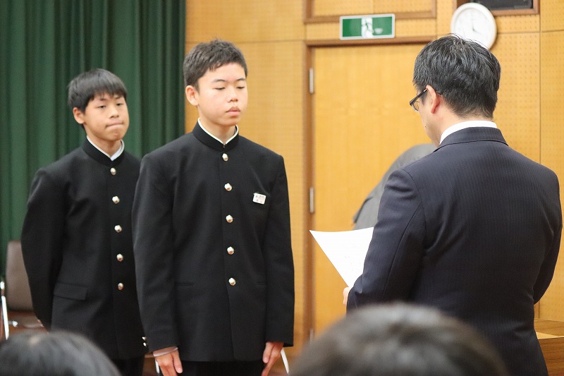 伝達表彰では、陸上部、ソフトテニス部、卓球部、税に関する作文において、優秀な成績を収めた生徒の表彰がありました。また、英語検定・漢字検定の2級・準2級合格者の紹介もありました。