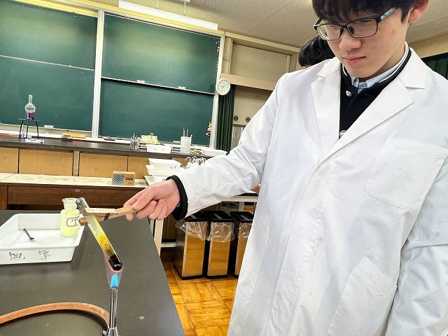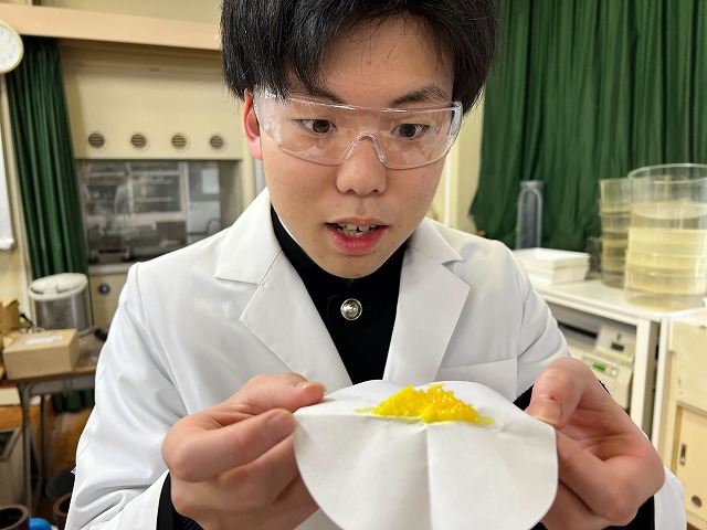 3年生の理科の授業で、高校化学基礎の内容である「同素体」の実験を行いました。斜方硫黄・単斜硫黄・ゴム状硫黄を実際に作製・観察し、同じ元素であっても原子の結びつき方(分子構造)が異なることで性質が大きく変化することを確認しました。